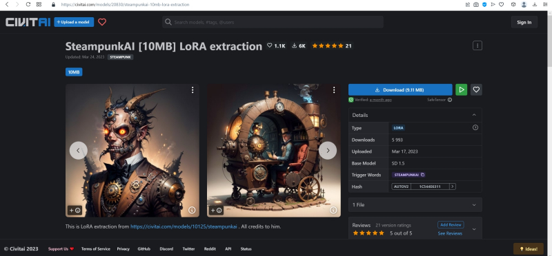 Por exemplo, Civitai.com, um repositório aberto de muitos recursos para entusiastas de text2image, tem um LoRA chamado SteampunkAI. Foi criado com base em um checkpoint, especialmente treinado para desenhar no estilo correspondente, e pode ser usado com qualquer outro checkpoint, proporcionando um estilo totalmente reconhecível e espetacular. Para baixar o arquivo .safetensors correspondente, basta clicar no longo botão azul no lado direito da página da web.