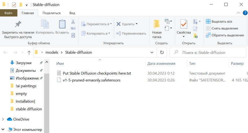 O arquivo de modelo baixado v-1-5-pruned-emaonly.safetensors deve ser colocado em uma pasta dedicada para modelos dentro do diretório de instalação do Stable Diffusion: /models/Stable-diffusion. Inicialmente, está vazio, exceto por um arquivo de texto de comprimento zero com o nome revelador “Coloque pontos de verificação de difusão estável aqui” – “pontos de verificação” são apenas arquivos com pesos treinados em um determinado conjunto de imagens para uma determinada rede neural.
