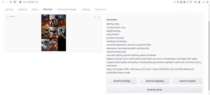 Vamos adicionar certeza ao que exatamente queremos ver os robôs representados. Em prompts positivos, em vez de apenas “robô”, escreveremos “robô lutador, aço brilhante” e, nos negativos, um dos conjuntos indesejados padrão de termos contextuais (prompt de conteúdo indesejado): “lowres, anatomia ruim, mãos ruins , texto, erro, falta de dedos, dígito extra, menos dígitos, cortado, pior qualidade, baixa qualidade, qualidade normal, artefatos jpeg, assinatura, marca d’água, nome de usuário, desfocado, nome do artista”. Muito mais interessante, não é?
