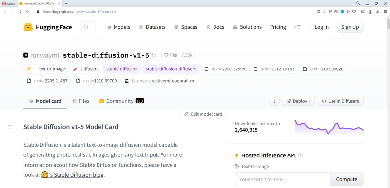 O próprio modelo Stable Diffusion, versão 1.5 (hoje já existem projetos posteriores do próprio Stability.ai e análogos de autoria de outros desenvolvedores, mas no momento é este o mais popular entre os entusiastas da atividade text2image) está disponível – novamente para grátis, sem SMS e registros – no repositório da comunidade online de codificadores AI Hugging Face.