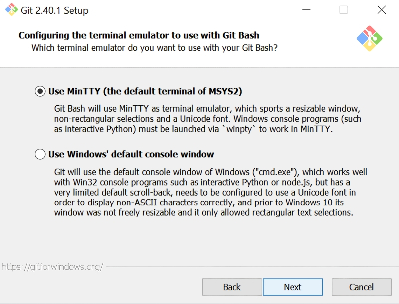 Outro ponto: na janela “Configurando o emulador de terminal para usar com o Git Bash”, é melhor escolher MiniTTY entre as opções oferecidas. Este não é um problema fundamental, e a janela padrão do console do Windows caberá aqui muito bem – mas por razões de melhor compatibilidade (com fontes Unicode, em primeiro lugar), o MiniTTY ainda é preferível.