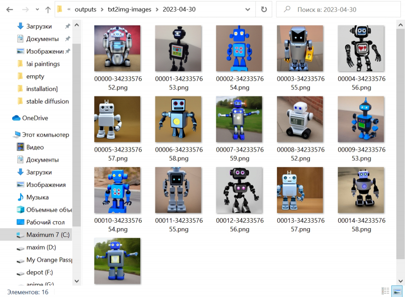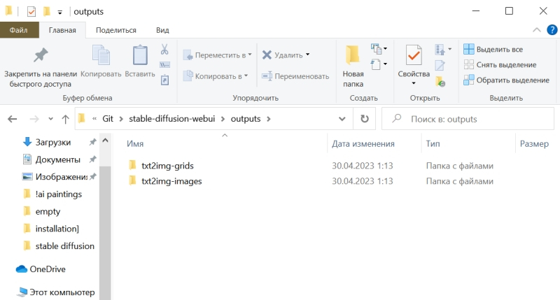A propósito, no diretório inicial do Stable Diffusion, agora existe uma pasta de saída que armazena os resultados: as próprias imagens (txt2img-images) e montagens gerais de gerações em lote (txt2img-grids). Dentro dessas pastas, as imagens são colocadas em subdiretórios rotulados com a data atual.