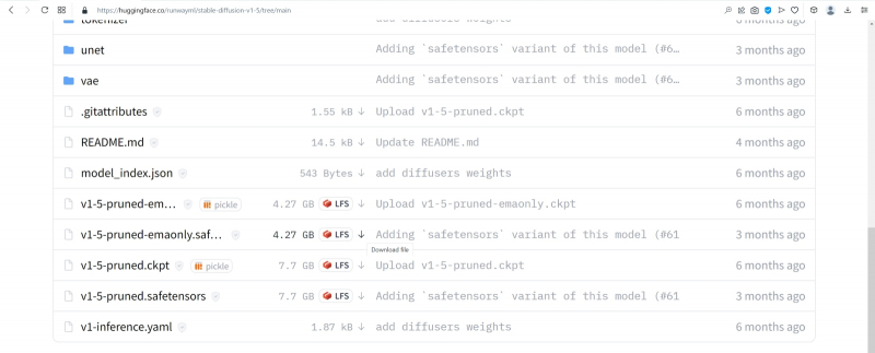 Para baixar este modelo, você deve ir até a guia Arquivos na interface web de sua página no repositório, rolar um pouco para baixo – e clicar na seta pouco perceptível com um sublinhado à direita das letras “LFS” no linha que começa com “v-1 -5-pruned-emaonly.safetensor”. Assim que você passa o mouse sobre a seta, uma janela aparece com uma pequena inscrição “Baixar arquivo”, você pode clicar e ter paciência: o arquivo ocupa vários GB.