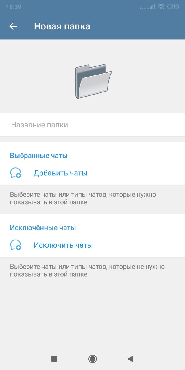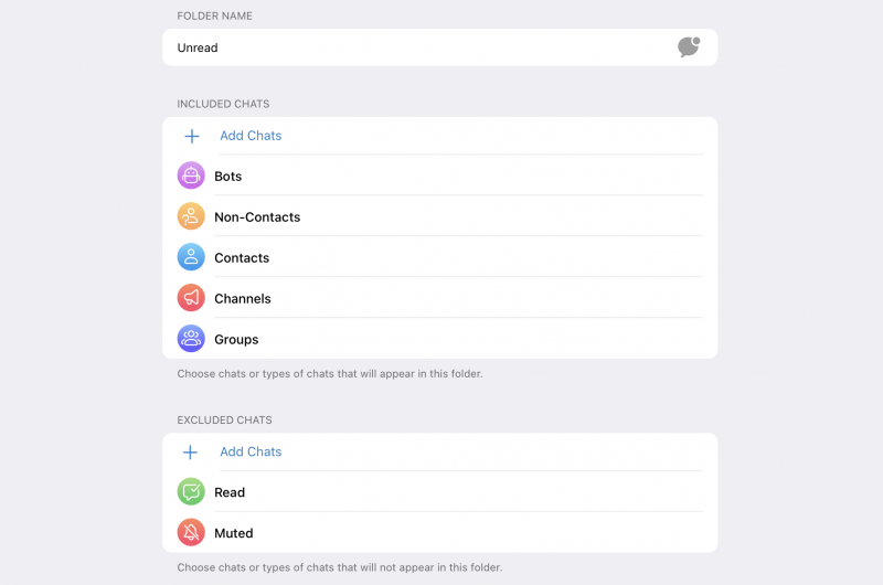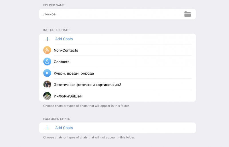 A principal maneira de configurar pastas é criar duas listas: chats que serão adicionados à pasta e chats que serão excluídos da pasta. Crie uma pasta de Fórmula 1, adicione todos os bate-papos e canais sobre o assunto, leia no caminho do trabalho – beleza! Mas por que então precisamos de uma lista de chats que serão excluídos da pasta? De fato, em princípio, uma lista seria suficiente – bate-papos adicionados. O fato é que os desenvolvedores forneceram várias máscaras pré-definidas para filtrar chats, permitindo configurar pastas com muito mais flexibilidade.