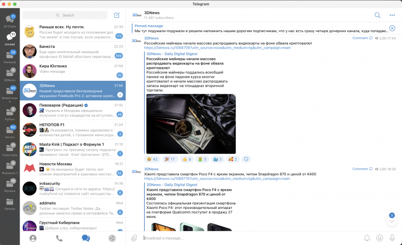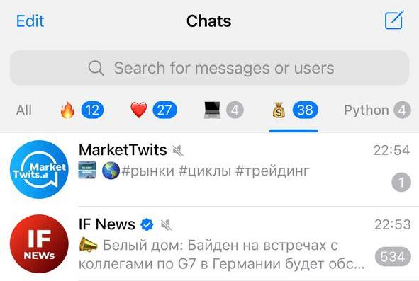 Dentro das pastas, os chats com mensagens habilitadas e desabilitadas são mostrados em uma única lista. Assim, na pasta Investimentos, ainda os verei em ordem cronológica e posso entender facilmente quais deles têm as mensagens mais recentes. Um leitor atento neste momento certamente expressará uma boa surpresa – mas e os bate-papos “cinza” e o análogo da cegueira de banner? Bem, para não perder algo interessante sobre um tópico específico, você deve usar …