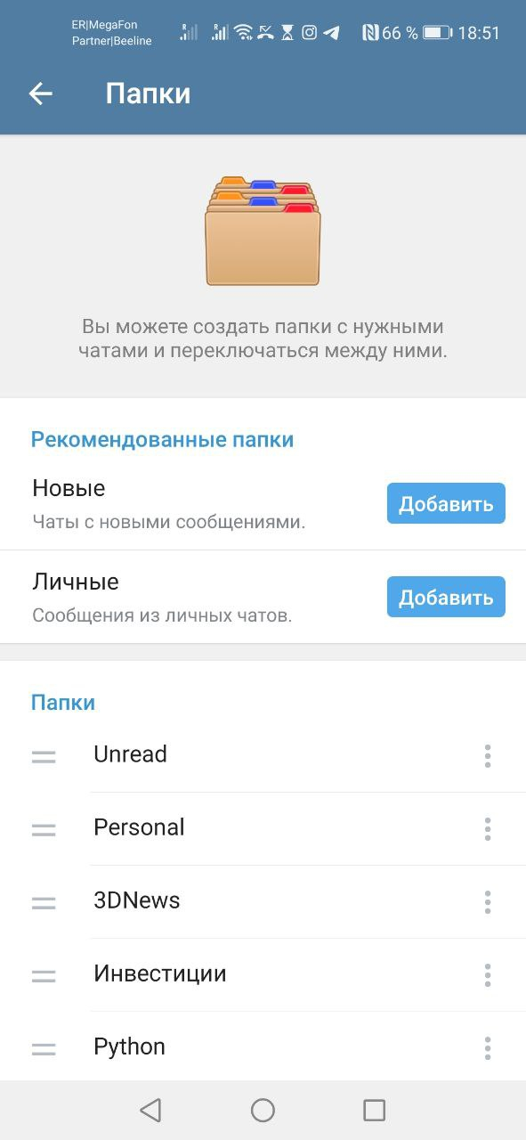 Dependendo da versão do programa e da plataforma do usuário, nesta fase, o Telegram pode oferecer a adição de opções de pastas pré-configuradas, como “Pessoal” (Pessoal) e “Não lida” (Não lida). No primeiro caso, o programa filtrará todas as mensagens pessoais de pessoas reais (não chats, não canais e não bots), mesmo que não estejam em sua lista de contatos, no segundo, todos os chats (tanto pessoais quanto em grupo, e canais) com mensagens não lidas. Se você não é um usuário muito experiente, aconselho a concordar com a primeira opção (“Pessoal”) – pelo menos isso permitirá que você separe as mensagens pessoais de todo o resto. Mas a utilidade do segundo (“Não lido”) é duvidosa – nele você obterá o mesmo despejo de antes de tudo em sequência, exceto talvez sem bate-papos nos quais não haja mensagens não lidas.