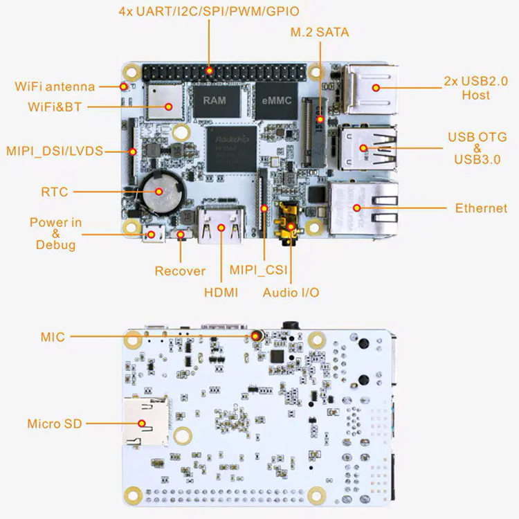 A base é o processador Rockchip RK3566, que contém quatro núcleos de computação Cortex-A55 com velocidade de clock de até 1,8 GHz, um acelerador gráfico Arm Mali-G52 e uma NPU. A quantidade de RAM LPDDR4 / LPDDR4X pode ser de 2, 4 e 8 GB. Para armazenamento de dados, é utilizado um módulo eMMC integrado com capacidade de 8 a 128 GB. Há também um conector M.2 para um SSD e um slot para cartão microSD. O equipamento inclui o codec de áudio ES8388, controlador Realtek RTL8211F-CG 1GbE, adaptadores Wi-Fi 5 e Bluetooth 4.2 (BL-Link BL-M8821CS1).