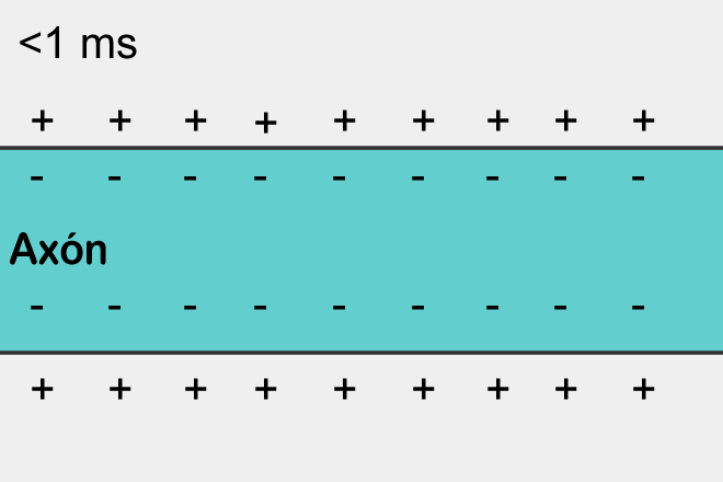 O impulso nervoso mais simples (uma área com carga negativa na parte externa da membrana e carga positiva na parte interna), propagando-se ao longo da superfície de um axônio (cuja carga na parte externa é inicialmente positiva) devido a uma mudança em o potencial transmembrana (fonte: Wikimedia Commons)