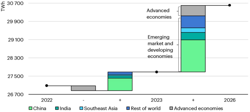 Mudanças no consumo de eletricidade por região do mundo em 2022-2023. e previsão para 2026, TWh (fonte: IEA)