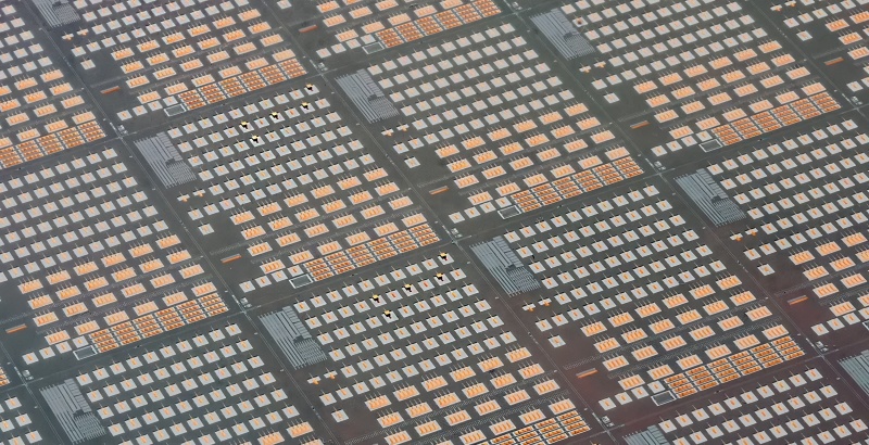 Uma das limitações mais importantes da fotônica de silício é a incapacidade de litografiar um gerador de radiação óptica coerente (laser) em um substrato de silício; por esse motivo, micro e nanolasers devem ser criados separadamente e depois integrados em uma placa vazia com circuitos ópticos (usando o método flip-chip, por exemplo; na foto mostrada, os módulos de laser são grandes blocos com nervuras cinza escuro) , o que não simplifica a fabricação desses chips e não os torna mais baratos (fonte: IEEE Spectrum)