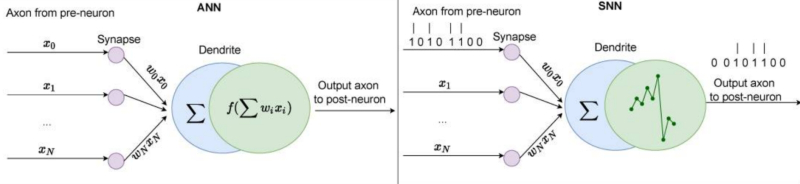 Representações esquemáticas dos princípios de operação de perceptrons de uma rede neural artificial (ANN) “regular” e de uma rede neural pulsada (SNN) (fonte: PubMed)