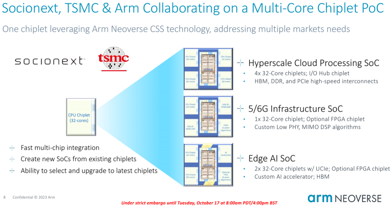 Um exemplo é o projeto conjunto da Arm, Socionext e TSMC, no qual está em andamento o desenvolvimento de um processador chiplet universal, que em diversas opções de layout será procurado por hiperscaladores, fornecedores de infraestrutura 5G/6G e desenvolvedores de sistemas periféricos de IA.