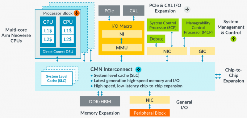 O subsistema de memória pode ter até 8 canais DDR5 e os recursos de E/S incluem 4 blocos de 16 pistas PCIe ou CXL. Também é possível combinar dois chips CSS N2 em um único pacote, o que dá até 128 núcleos por chip. A rede mesh Neoverse CMN-700 é usada como interconexão interna.