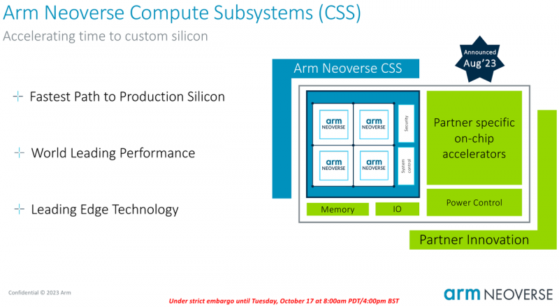 A iniciativa Arm é baseada na plataforma de processador Arm Neoverse Compute Subsystem (CSS), anunciada em agosto no HotChips 2023. Neoverse CSS N2 (Genesis) é um conjunto pronto de soluções Arm IP, incluindo núcleos de processador, sistema de interconexão interna, subsistemas de memória, E/S, gerenciamento de energia, mas deixando espaço para a integração de desenvolvimentos de parceiros – vários motores, aceleradores, etc.