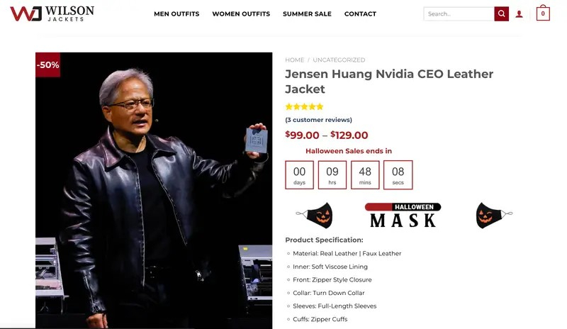 Um anúncio de jaqueta de couro masculina na Amazon usa o nome e a foto de Huang para otimizar os resultados da pesquisa. A página do produto Wilson Jackets, intitulada “Jensen Huang Nvidia CEO Leather Jacket”, apresenta versões em couro falso e real. Outra “jaqueta Jensen Huang” está listada no Jacketpop por US$ 105.