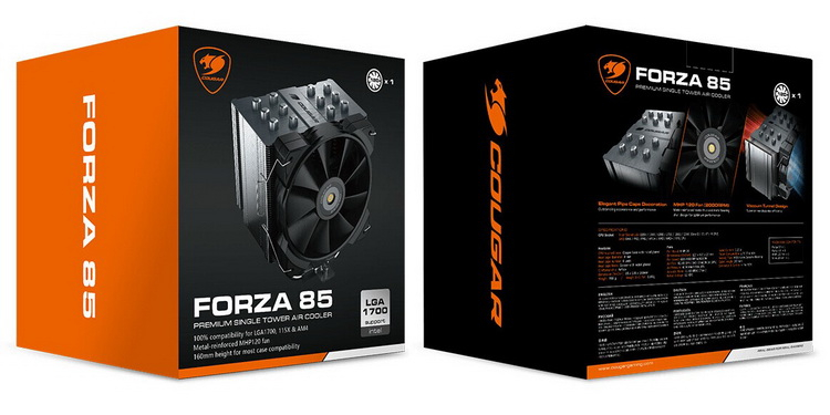 O cooler Cougar Forza 85 suporta plataformas Intel LGA 115X / 1366/1200/1700/2011/2066, bem como AMD AM4 / FM2 / FM1 / AM3 + / AM3 / AM2 + / AM2. O design do cooler não cobre nenhum slot de RAM, além disso, o dissipador de calor suporta a instalação de uma segunda ventoinha.