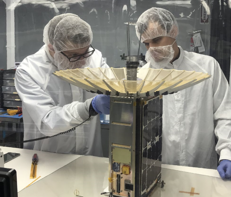 Engenheiros do desenvolvedor de plataforma Tyvak Nano-Satellite Systems Inc. instalação de painéis solares na espaçonave CAPSTONE. Foto da NASA/Dominic Hart
