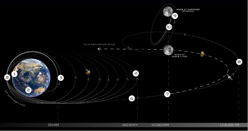 O design balístico também diferia do voo típico de Hohmann. Devido ao baixo empuxo dos motores do estágio superior, para reduzir as perdas gravitacionais, a aceleração teve que ser realizada por vários pulsos no perigeu da órbita elíptica. Para enviar o CAPSTONE em direção à Lua, o motor do estágio superior disparou seis vezes. Além disso, o cubesat corrigiu a própria trajetória. Durante o vôo, ele se afastou da Terra 1,5 milhão de km, e então começou a “cair” para trás, ao longo do caminho foi interceptado pela gravitação da Lua e com a ajuda de seus motores em 13 de novembro de 2022 entrou no órbita do halo, que finalmente se formou uma semana depois. Aqui, CAPSTONE passará meio ano, aproximando-se da superfície a 1600 km na peri-aldeia e afastando-se a 70.000 km na vila-a.