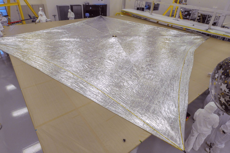 A vela solar totalmente implantada do NEA Scout cubesat tem “o comprimento de um ônibus escolar”. Foto da NASA/MSFC/Emmett Given