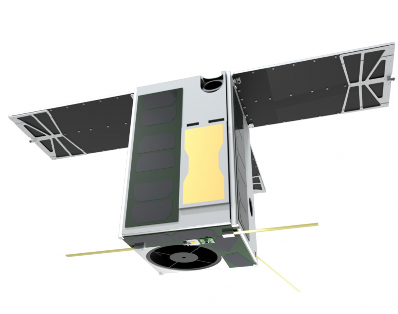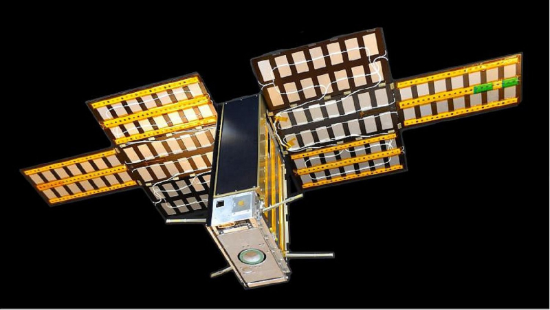 «Seis unidades “cubesat RainCube (Radar em um CubeSat), equipado com um radar de banda Ka com uma antena suspensa. Fonte: https://www.nanosats.eu/sat/raincube