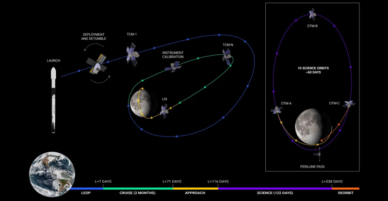 «Lunar Lantern ”é lançado em uma trajetória intrincada, o vôo ao longo do qual até a órbita alvo levará cerca de três meses. Após a chegada, ele entrará em uma órbita de halo específica com uma população de 70.000 km e uma realocação de cerca de 15 km sobre o Pólo Sul. “A razão para escolher esta órbita é poder chegar perto o suficiente da Lua para obter uma boa reflexão do feixe de laser da superfície, ao mesmo tempo em que possui uma órbita estável que requer pouco combustível [para correções]”, explicou Barbara Cohen, Cientista do Projeto Lanterna Lunar no Goddard Center (NASA).