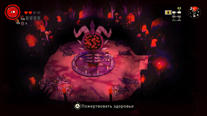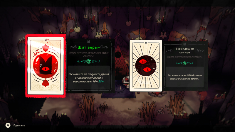 Em geral, o sistema de progresso tanto do jogador quanto de seu personagem é um dos pontos mais fortes do Cult of the Lamb. Você constantemente desbloqueia novas “passivas”, mais e mais tipos de armas perigosas são encontrados, as cartas de tarô podem afetar significativamente a próxima corrida – você pode comprar novas cartas em lojas locais para que elas apareçam durante os passeios. E para completar tarefas opcionais de personagens menores, você desbloqueia runas que servem como uma espécie de modificadores. Com uma das runas, você receberá quatro cartas no início da corrida, mas elas não cairão mais. Por outro lado, o dano que você recebe dobrará, mas o dano causado aumentará a cada morte.