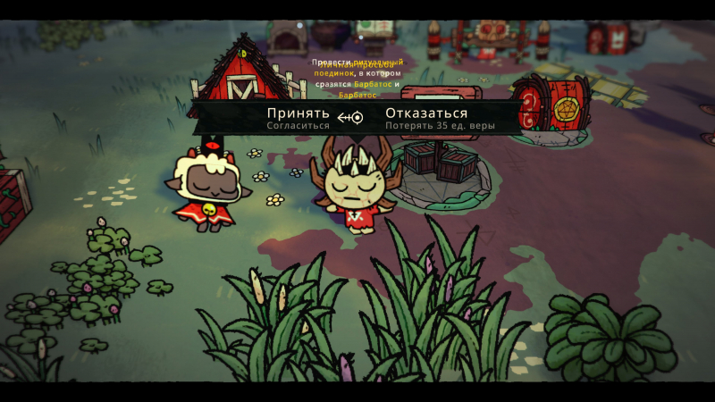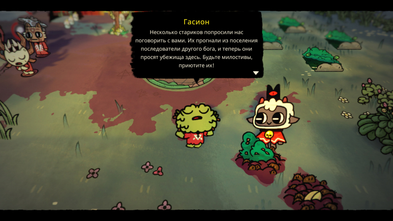 Às vezes são tarefas simples – construir, por exemplo, três elementos decorativos como lanternas ou fontes. E às vezes os personagens pedem que você sacrifique alguém, o que você pode não querer fazer. Se você recusar, você perderá pontos de fé. Concordo – você perderá um seguidor e terá que procurar um novo. O mais estranho é que as solicitações feitas pelos personagens nem sempre coincidem com as tarefas da lista de tarefas. Um porco veio até mim e disse que sua missão foi cumprida e ele quer ser sacrificado. Depois que a ação foi feita, descobriu-se que um nome completamente diferente foi escrito na missão. Como resultado, todos ficaram com raiva, um se tornou dissidente, ninguém orou – em geral, foram necessários vários dias no jogo para lidar com as consequências.