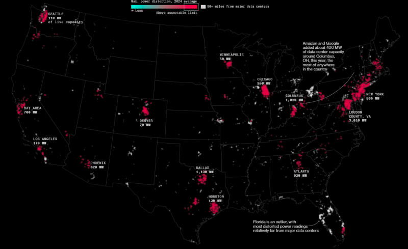 A investigação demonstrou que a ascensão dos centros de dados de IA está a colocar maior pressão sobre a rede eléctrica dos EUA e a afectar a qualidade da energia fornecida a milhões de consumidores, especialmente em regiões com uma elevada concentração de centros de dados como a Virgínia. Grandes data centers levam ao aparecimento de oscilações harmônicas na rede elétrica, distorções periódicas de frequência e tensão. Para os consumidores comuns, isto significa um risco aumentado de faíscas aleatórias, que podem até causar um incêndio. De acordo com o Whisker Labs, a ocorrência cada vez mais frequente de tais harmônicos é um sinal precoce de problemas iminentes. A investigação demonstrou que mais de três quartos dos problemas comunicados nas redes eléctricas dos EUA ocorrem num raio de 80 km de grandes centros de dados. Além disso, as novas instalações são frequentemente adjacentes às grandes cidades.