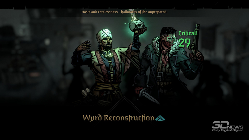 Ao mesmo tempo, o jogo gerou constantemente histórias únicas. Com o orgulhoso Friedrich, passamos dos primeiros monstros ao quase último chefe, mas o espadachim errou um golpe crítico vil e morreu. Jester Herald estava tão relutante em morrer que sempre teve sorte em ataques que deveriam matá-lo. Vestal Gloria já tinha visto tanto que a única maneira de se livrar do estresse era uma farra de uma semana. E assim por diante – o que está acontecendo em Darkest Dungeon pode ser recontado como uma comédia engraçada e como um horror sangrento. Cada run, cada playthrough era único, mesmo com todas as mecânicas já bem estudadas, já que quase tudo – dos lutadores disponíveis aos locais – era gerado aleatoriamente.