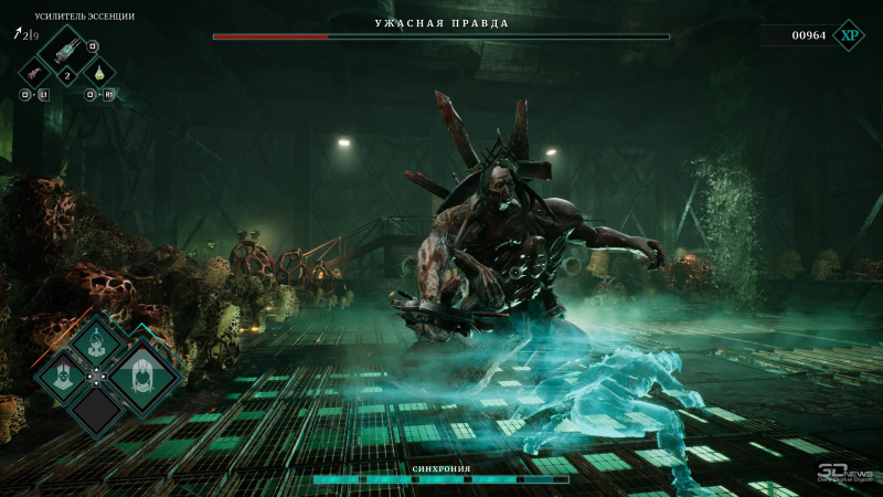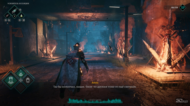A cura é implementada de forma interessante. Você sempre carrega consigo vários amplificadores de essência, que são restaurados quando você está sentado perto do fogo, mas esses não são seus kits de primeiros socorros habituais. Ao usar um amplificador, a saúde da essência selecionada é reabastecida, mas ao mesmo tempo, parte das “vidas” é tirada do resto. É muito mais eficaz curar com ataques – cada um de seus golpes melhora a saúde de todas as essências. Em outras palavras, o jogo incentiva você a alternar entre personagens – se um deles estiver gravemente ferido, você deve levar outra pessoa para restaurar sua saúde e evitar a morte. A morte de qualquer essência significa o fim do jogo – você retorna à última fogueira e a experiência coletada é retirada, como em todos os soulslices.