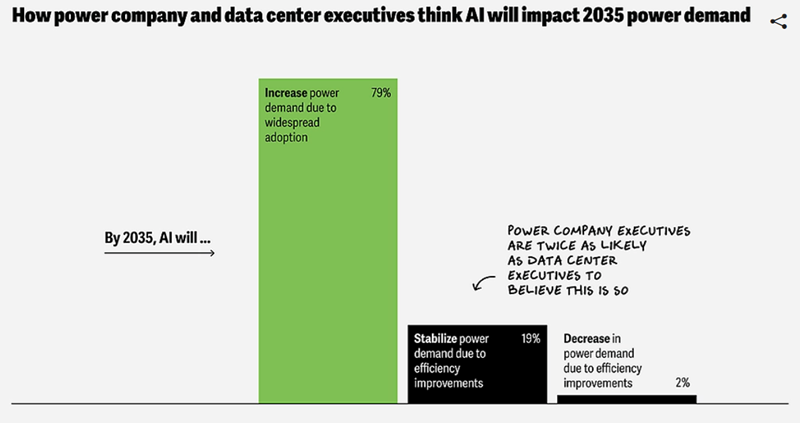 A North American Electric Reliability Corp. (NERC), órgão regulador dos EUA responsável pela supervisão da rede elétrica e da infraestrutura relacionada, afirmou que conectar data centers à eletricidade é atualmente muito arriscado devido ao seu consumo instável. A situação pode piorar com o advento de aceleradores com consumo de energia de 15 kW. Em abril, a Deloitte informou que as usinas nucleares poderiam suprir 10% da demanda futura de eletricidade por data centers nos EUA, mas precisarão ser construídas mais rapidamente.