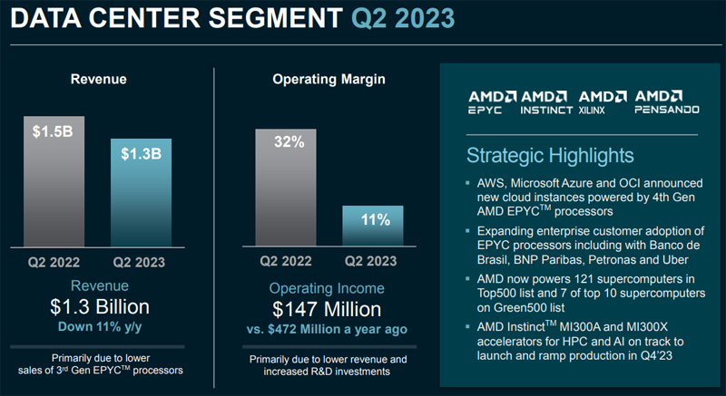 No segmento de data center, a receita trimestral foi de US$ 1,3 bilhão, 11% menor que o resultado de US$ 1,5 bilhão do ano passado.A AMD atribui isso à fraca demanda por processadores EPYC no segmento corporativo. A empresa esclareceu que a demanda por EPYC de terceira geração caiu acentuadamente, mas a receita da venda de processadores de quarta geração quase dobrou consistentemente.