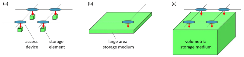 Três abordagens para organizar a memória do computador: a) semicondutor – combinando dispositivos de acesso com células de armazenamento, b) magnético – meio de armazenamento não alocado com um dispositivo de acesso móvel, c) líquido – com meio de armazenamento volumétrico e dispositivos de acesso estacionários (fonte: IMEC)