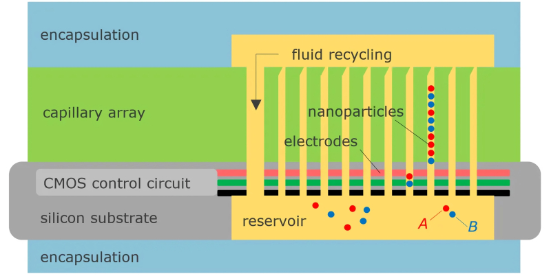 Assim, uma sequência de símbolos escritos em uma célula base, uma palavra de máquina convencional, será simplesmente uma sequência de partículas com propriedades diferentes – o principal é selecioná-los de modo a distinguir com segurança entre “zeros” e “uns” ao ler informações e manipulá-las livremente ao escrever. Para essas operações, o IMEC propõe a utilização de estruturas CMOS semicondutoras convencionais, o que significa que os tipos de partículas – portadoras de dados na memória coloidal – devem diferir entre si, por exemplo, na magnitude da carga elétrica. Não há grandes problemas com a leitura: “puxando” nanopartículas carregadas uma de cada vez de um determinado poço capilar e fixando-as na saída de seu barril, “zero” agora retornou ao reservatório comum, ou “um” é um assunto simples. Outra questão é registrar dados: capturar uma partícula com a quantidade necessária de carga em um reservatório e colocá-la em um poço estritamente definido é definitivamente uma tarefa de engenharia com um asterisco.