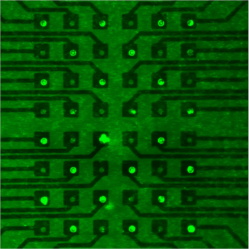 Os pontos brilhantes são nanopartículas fluorescentes de poliestireno que entram (a diferença de brilho corresponde à profundidade de imersão) nos poços quadrados do protótipo de armazenamento coloidal durante o processo de gravação (fonte: IMEC)
