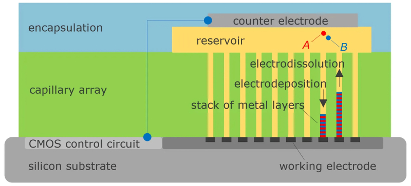 O princípio de funcionamento da memória líquida eletrolítica: as setas mostram o processo de deposição de íons (eletrodeposição) e o processo inverso de retorno das camadas metálicas previamente acumuladas no capilar em solução (eletrodissolução) (fonte: IMEC)