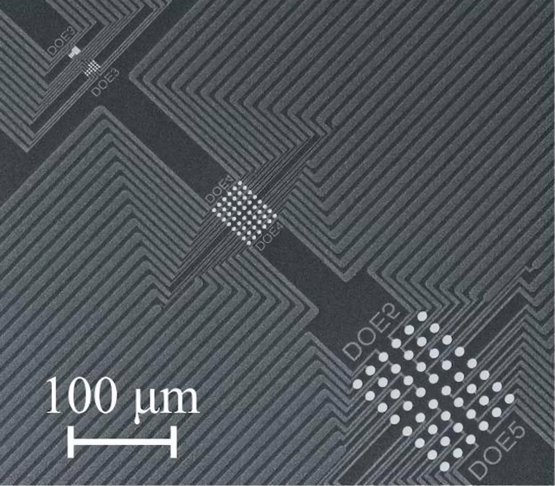 A superfície do microcircuito que serviu aos pesquisadores como confirmação do conceito de memória eletrolítica: grupos de círculos brancos são arranjos de poços com diâmetro de 80-150 nm (diferentes grupos de capilares – para avaliar a dependência da velocidade de gravação/ operações de leitura em suas dimensões) e uma profundidade de 300 nm (fonte: IMEC)