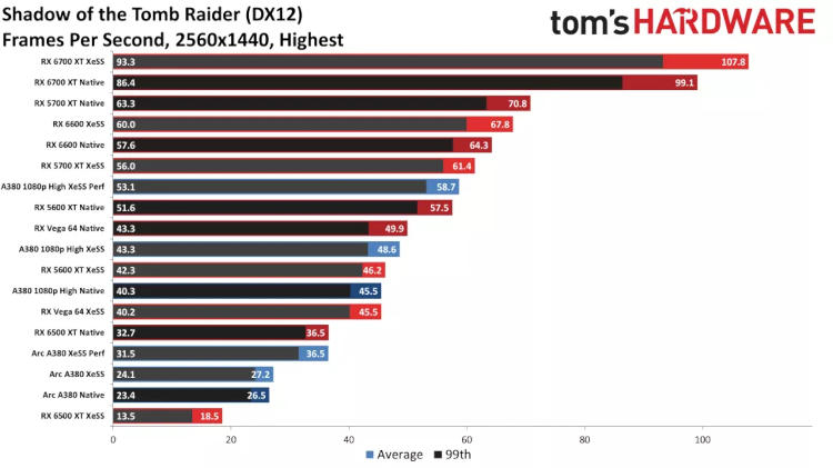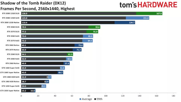 A Resource Tom’s Hardware realizou testes mais aprofundados, utilizando várias placas de vídeo NVIDIA e AMD – gerações anteriores e atuais com resolução de 2560 × 1440 pixels. Os resultados se mostraram interessantes: o Intel XeSS funcionou em todos os modelos testados, mas nem sempre proporcionou um aumento significativo de desempenho e, em alguns casos, houve também um rebaixamento no desempenho, às vezes até significativo. Os autores do material explicaram o efeito negativo pelo fato de que, em alguns modelos, as instruções DP4a são suportadas apenas no modo emulador – isso afetou, em particular, os processadores gráficos AMD Vega e Navi de primeira geração.