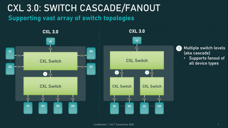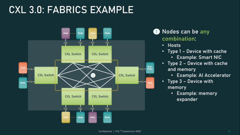 O próprio fabric CXL 3.0 agora permite a criação e conexão de dispositivos multi-head, recursos de gerenciamento de fábrica expandidos, suporte aprimorado para pools de memória, modos de coerência avançados e suporte para comutação multinível. Ao mesmo tempo, o CXL 3.0 manteve a compatibilidade com todas as versões anteriores – 2.0, 1.1 e até 1.0. Neste caso, algumas das funções disponíveis simplesmente não serão ativadas.