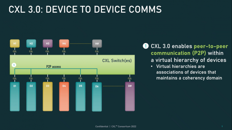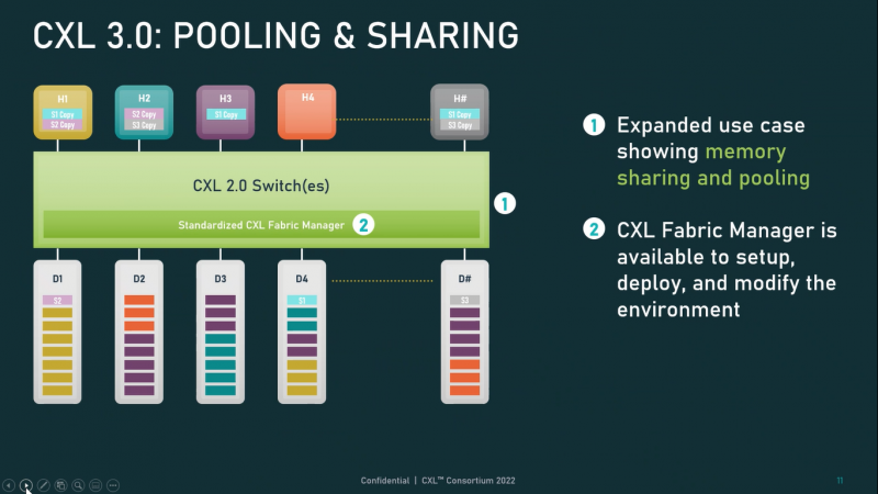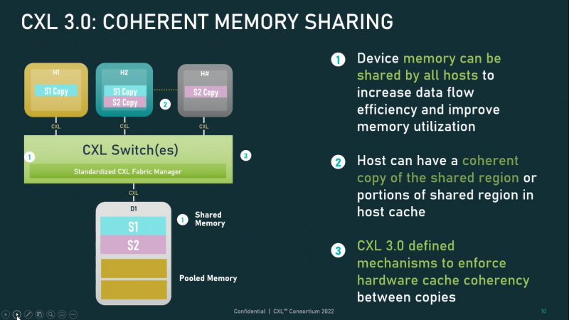 Ao mesmo tempo, é suportada uma organização hierárquica de grupos, dentro da qual é assegurada a coerência dos conteúdos de memória e caches (é fornecida a invalidação). Agora, além do acesso exclusivo à memória do pool, o acesso compartilhado por vários hosts a um bloco de memória de uma só vez também está disponível, além disso, com suporte de hardware para coerência. O pooling não é mais deixado para software de terceiros, mas é realizado por meio de um gerente de fábrica padronizado.