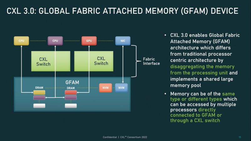 A combinação de novos recursos leva a ideia de separar memória e recursos computacionais a um novo patamar: agora é possível construir sistemas onde realmente existe um único pool de memória conectado ao fabric CXL 3.0 (Global Fabric Attached Memory, GFAM). separadamente dos módulos de computação. Ao mesmo tempo, a capacidade de endereçar até 4.096 pontos de conexão irá atingir os limites físicos da fábrica.