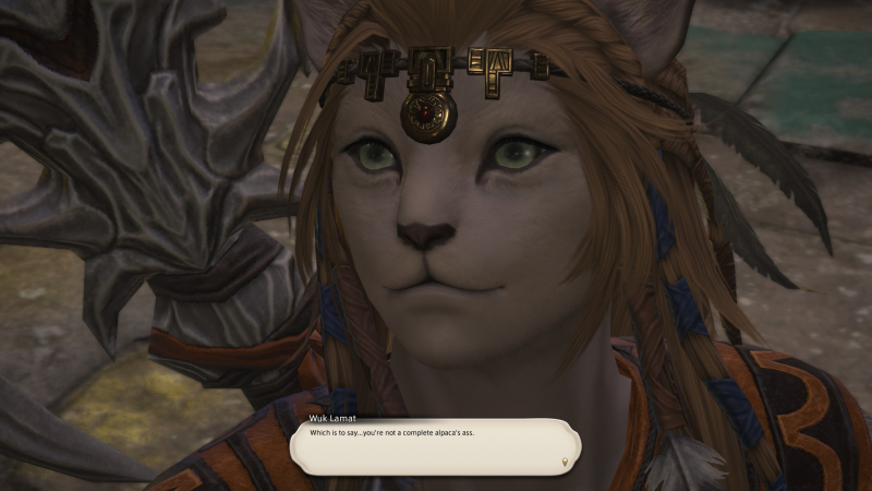 …Antes do lançamento de Dawntrail. Que acabou não apenas sendo mais chato que Stormblood, mas nunca foi capaz de ganhar velocidade ao longo de sua considerável extensão. Desta vez iremos ao novo continente de Tural para participar dos jogos que determinarão o herdeiro do trono local. Nosso personagem, conhecido no mundo de FF XIV como The Warrior of Light (ou simplesmente WoL), ajuda o resiliente e eternamente positivo Vuk Lamat a passar em vários testes, mas mais no papel de mentor do que de personagem principal. O que, em geral, é normal – nem todo dia você salva o universo com as próprias mãos. Agora, alguns jogadores estão criticando a própria Vuk Lamat e chamando-a de personagem ruim e a história desinteressante. Porém, não posso concordar com isso, pois a menina foi muito bem desenvolvida, e a trama levanta temas interessantes como conflitos por diferenças culturais, vida em geral, vida após a morte em particular, e assim por diante. Sem falar nos detalhes repentinos da biografia de um dos personagens principais.