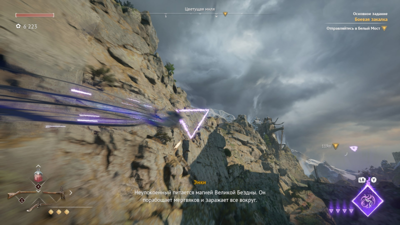 Mas por outro lado, você quer ignorar a narrativa, e não é como se ela estivesse tentando atrair a atenção para si mesma – há poucos vídeos no motor e as conversas, mesmo com personagens da história, são muito curtas. Os autores de Flintlock pareciam estar tentando trabalhar de acordo com o modelo FromSoftware, mas não entendiam completamente como o elemento narrativo funcionava ali. Se o enredo central não for excelente, então procurar pistas e detalhes sobre o mundo no mesmo Dark Souls é interessante – aqui as notas são chatas (e com uma fonte tão pequena você nem quer lê-las), e tudo mais caso contrário, não é de interesse. Era necessário tentar tornar o terreno naquele ambiente o mais transitável possível.