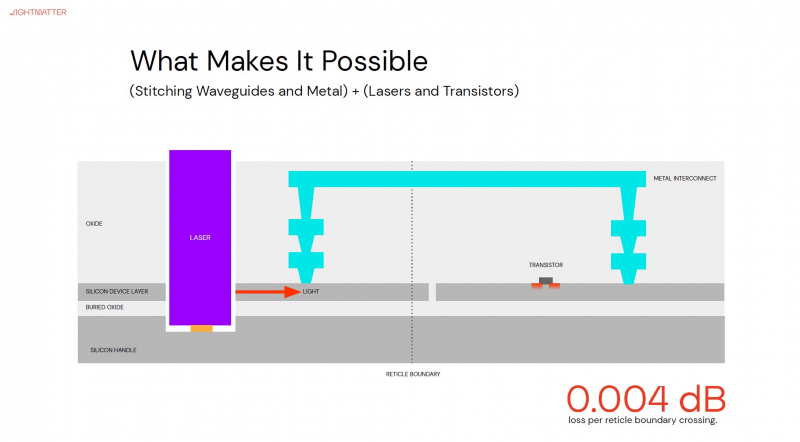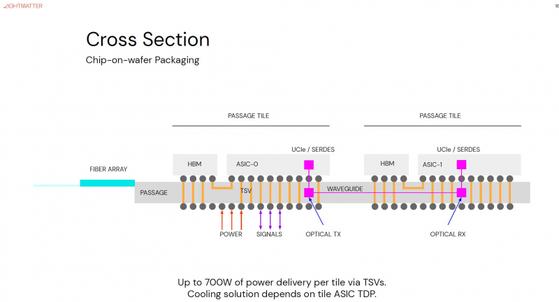 Mas a tecnologia Lightmatter Passage, projetada para substituir a interconexão elétrica por uma óptica, permitirá contornar esse problema. Na verdade, Passage é uma camada de silício universal que contém lasers, moduladores ópticos, fotodetectores, guias de onda, bem como transistores clássicos para acompanhar a lógica. No topo desta camada, Lightmatter oferece a colocação de chiplets de qualquer arquitetura.