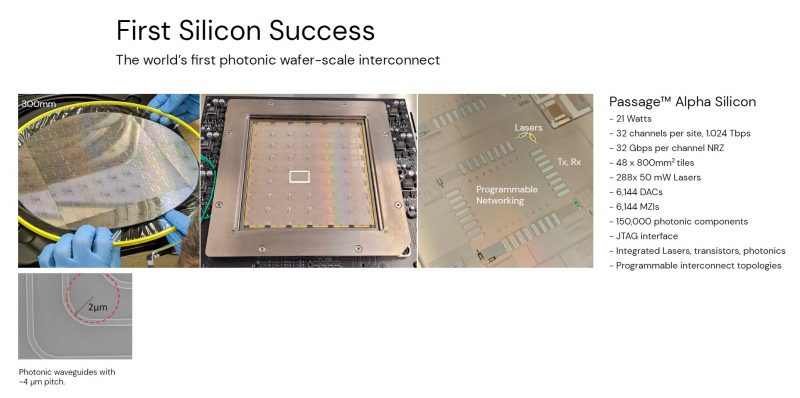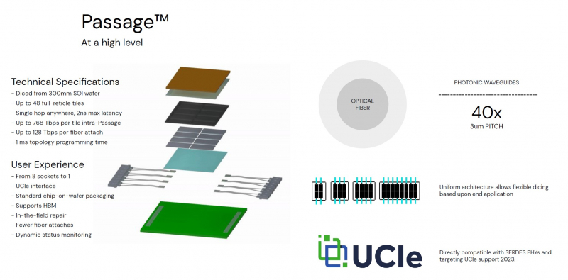 A base dessa tecnologia é um desenvolvimento proprietário da empresa, que permite “costurar” com precisão as conexões elétricas com vários guias de onda dentro de várias camadas de silício SOI. A implementação do teste de passagem já existente em silício consome 21 W, permite instalar até 48 chiplets com área de 800 mm2, fornece cada assento com 32 canais com largura de banda de 1024 Tbps, e a topologia de interconexão pode ser alterada dinamicamente .