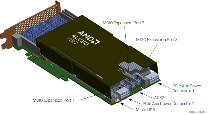 Alveo V80 é baseado no SoC Versal XCV80 HBM híbrido de 7 nm e inclui 32 GB de memória HBM2e com largura de banda de memória de 820 GB/s. O FPGA oferece 10.848 DSPs, 2,6 milhões de LUTs, 132 Mbits de BRAM e 541 Mbits de UltraRAM. Existem também dois núcleos Arm Cortex-A72 de uso geral, complementados por 4 ou 8 GB DDR4-3200 ECC, e um par de núcleos Arm Cortex-R5F. A placa possui um slot DIMM para instalação de 32 GB de memória DDR4.