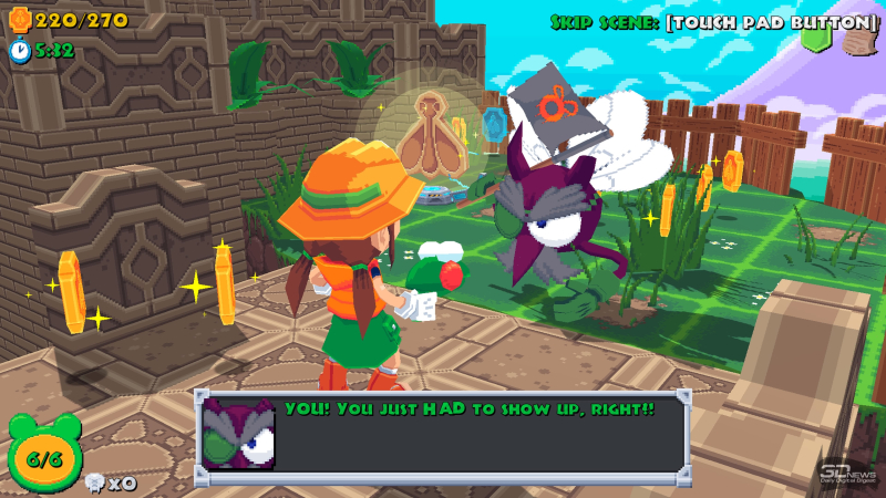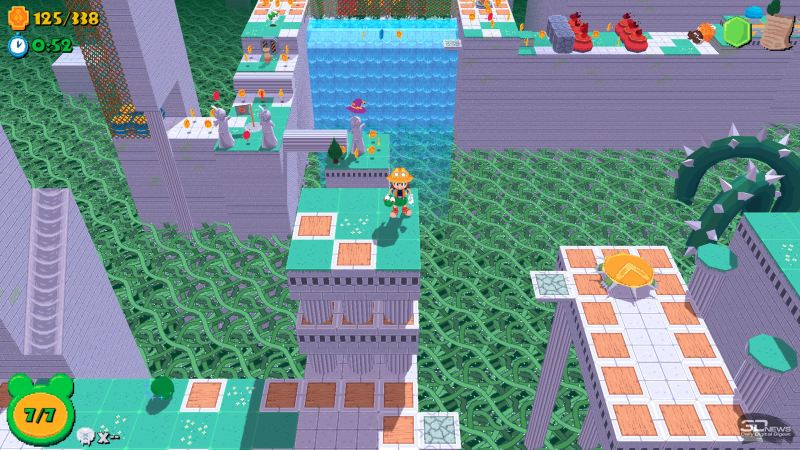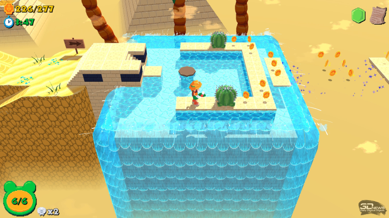 Claro, em termos de design de níveis, Frogun Encore está longe de Super Mario 64. Falta aquela combinação de profundidade e minimalismo – quando à primeira vista parece que tudo está no lugar mais visível, mas então você começa a interagir com o meio ambiente e admire os segredos que você descobriu. No entanto, o design não pode ser chamado de completamente primitivo – nem todos os itens colecionáveis ​​são encontrados instantaneamente; no caso de alguns, os quebra-cabeças de plataforma começam; Por exemplo, muitas vezes você pode ver pedras que explodem com a ajuda de vasos vermelhos, mas esses vasos estão localizados bem longe – é preciso ter cuidado no caminho até eles e na volta para não perder o item.
