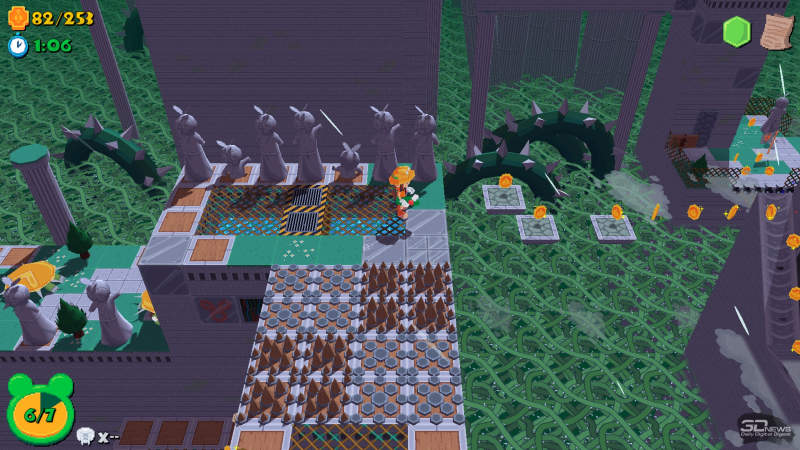 Em primeiro lugar, existem centenas de moedas espalhadas pelos níveis. Alguns estão simplesmente deitados em algum lugar, outros estão pendurados acima do solo, outros estão escondidos em baús ou em vasos e jarras – você pega os utensílios e os joga em algum lugar, já que não há botão de ataque regular aqui. Em segundo lugar, no processo de busca por moedas você encontra grandes esmeraldas verdes – duas em cada mapa. Também há sempre uma nota oculta e uma caveira de obsidiana – para a última, você precisa pular para o portal e passar em um pequeno teste separado.