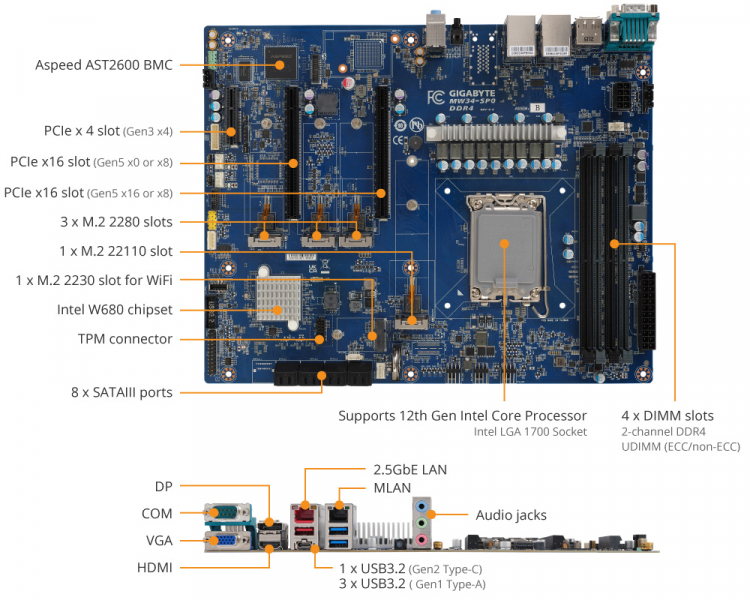 Assim, a placa Gigabyte MW34-SP0 ATX oferece um conjunto de recursos que podem ser encontrados em muitos modelos baseados no chipset Intel Z690 – quatro slots para memória UDIMM DDR4-3200 (ECC) dual-channel com capacidade total de até 128 GB, suporte para overclock do processador e memória, e etc. No entanto, o fabricante dotou-o de alguns recursos mais típicos para placas de servidor. Por exemplo, o novo produto oferece iKVM baseado no BMC ASPEED AST2600 com uma porta dedicada de 1 GbE.