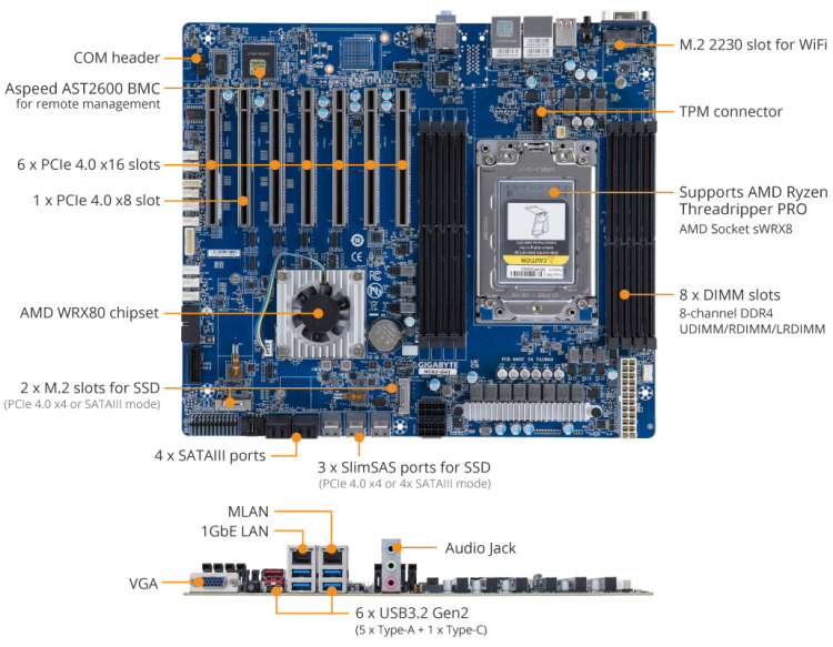A placa-mãe Gigabyte MC62-G41 para chips AMD é feita no formato CEB (305 × 267 mm). A novidade recebeu sete slots PCIe 4.0 x16. E apenas um deles funciona no modo x8. Todos os oito canais de memória DDR4-3200 (ECC) são trazidos para a placa, para que você possa instalar até 2 TB de RAM. Há suporte para módulos UDIMM, (3DS) RDIMM, LRDIMM.